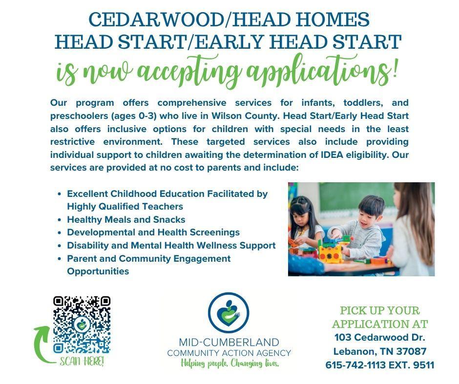 Cedarwood/ Head Homes/ Head Start/ Early Head Start is now accepting applications! Our program offers comprehensive services for infants, toddlers, and preschoolers (ages 0-3) who live in Wilson County. Head Start/ Early Head Start also offers inclusive options for children with special needs in the least restrictive environment. These targeted services also include providing individual support to children awaiting the determination of IDEA eligibility. Our services are provided at no cost to parents and include: -excellent childhood education facilitated by highly qualified teachers - healthy meals and snacks - development and health screenings - disability and mental health wellness support - parent and community engagement opportunities. Mid-Cumberland Community Action Agency.